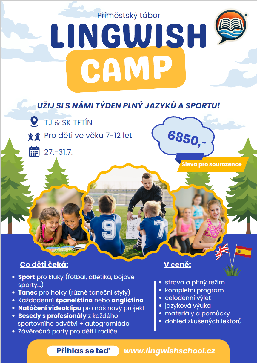 Hledáte pro své dítě léto plné pohybu, zábavy a přirozeného učení cizího jazyka? Lingwish Camp je příměstský tábor pro děti ve věku 7–12 let, kde kombinujeme sportovní aktivity s každodenní výukou angličtiny nebo španělštiny.